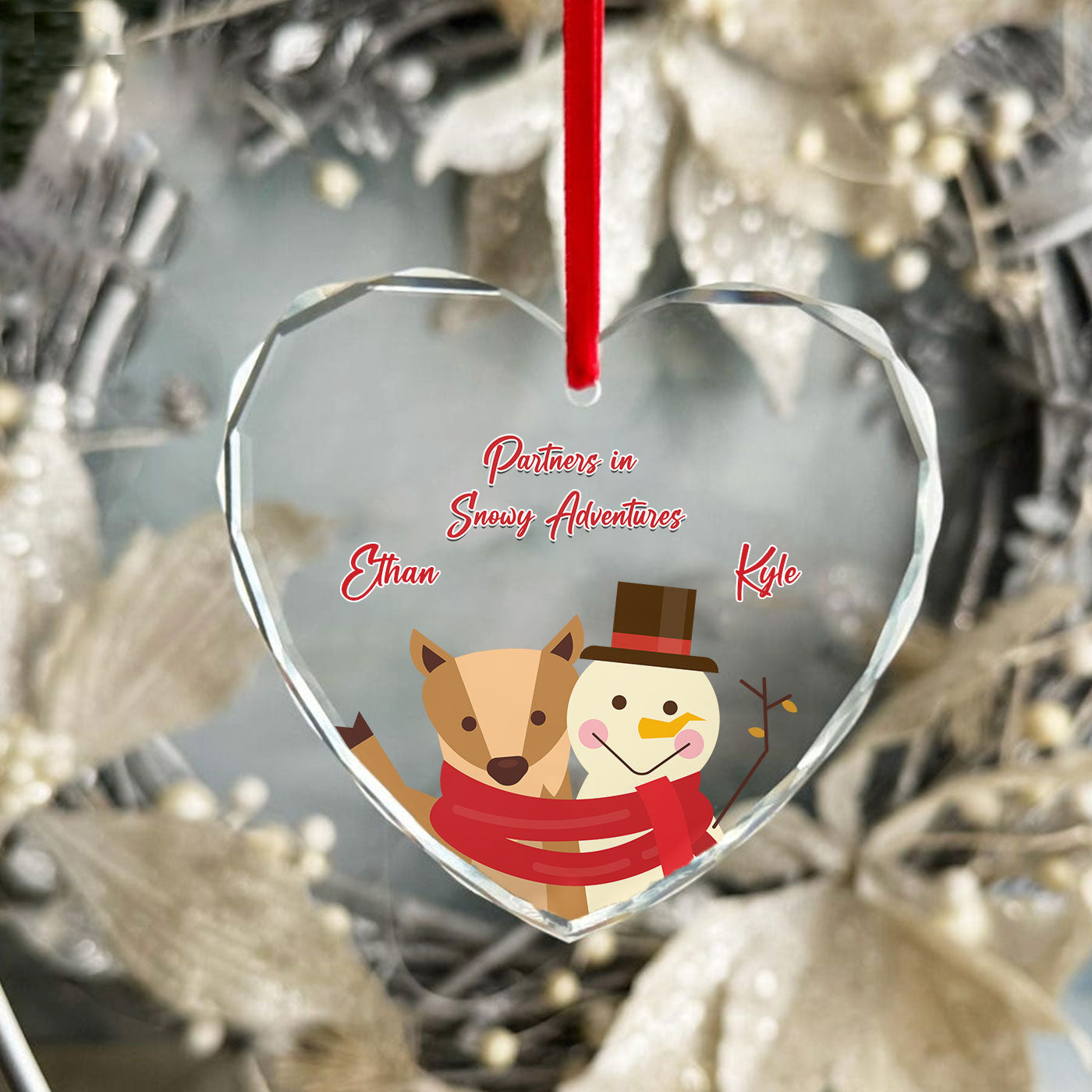 Partners in Snowy Adventures | Deer and Snowman Christmas | Glass Ornament - Heart / 3.10 X 2.90 in